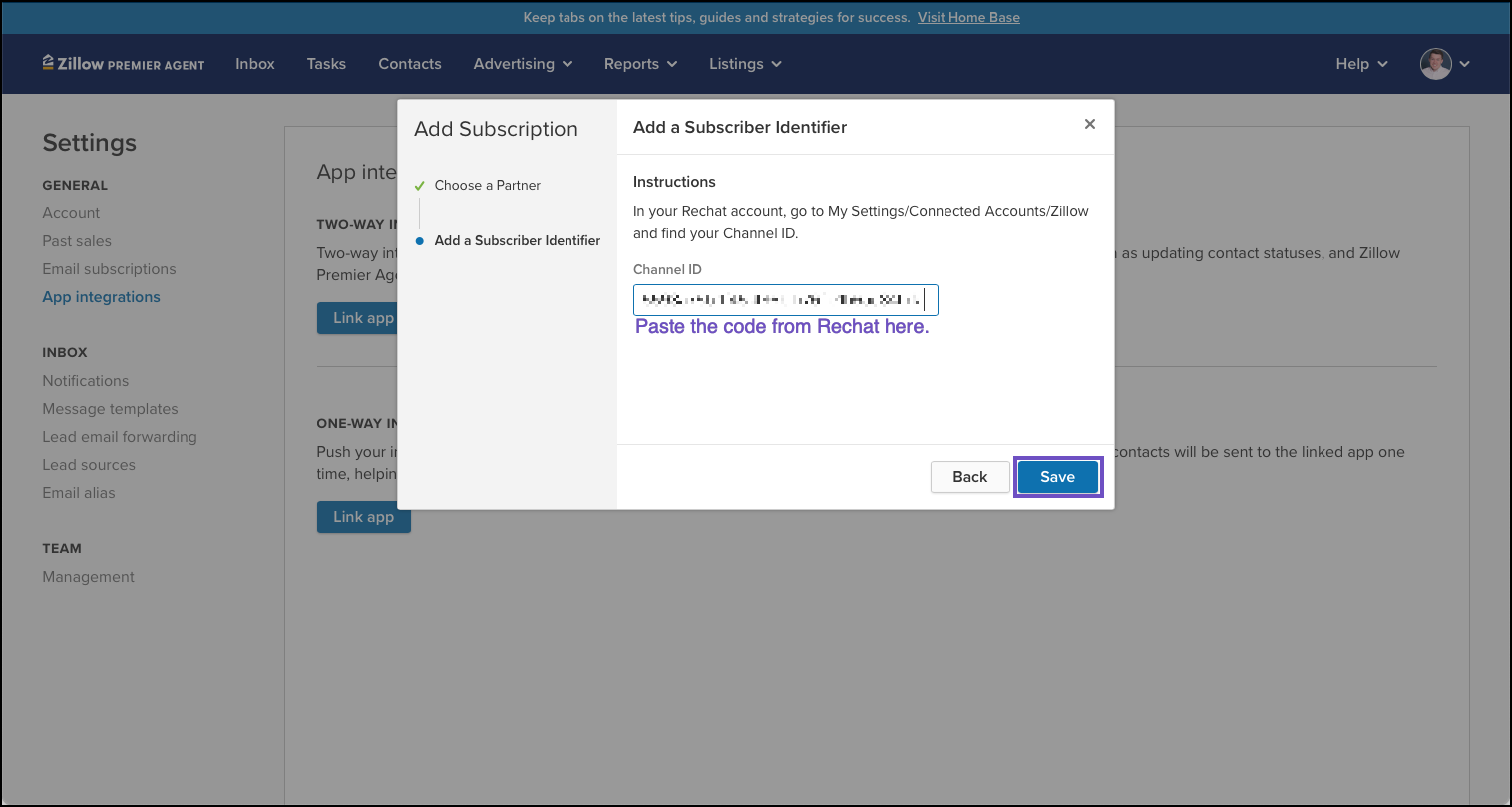 13\) Paste the code from Rechat into the "Channel ID" field and click "Save".
