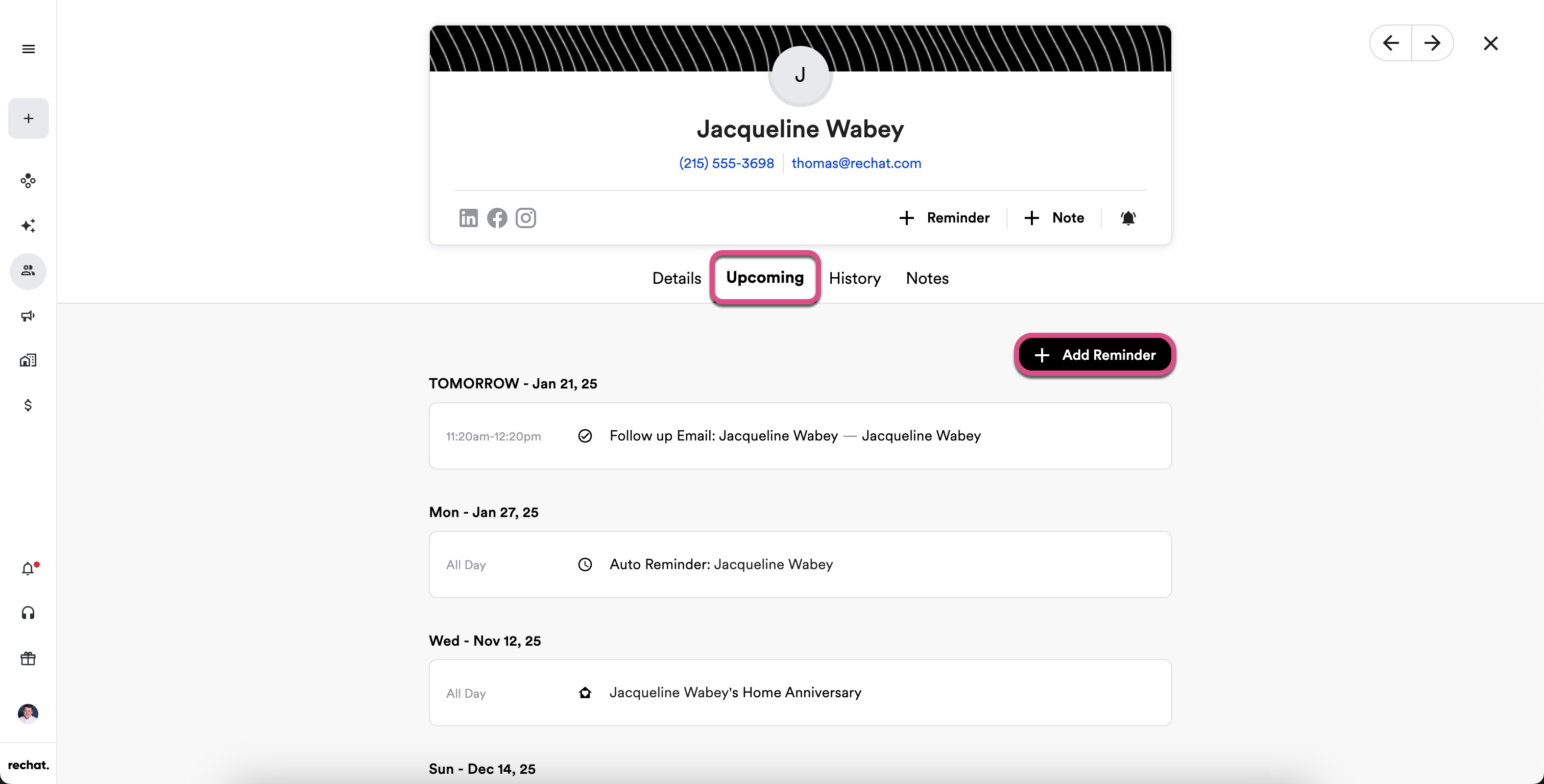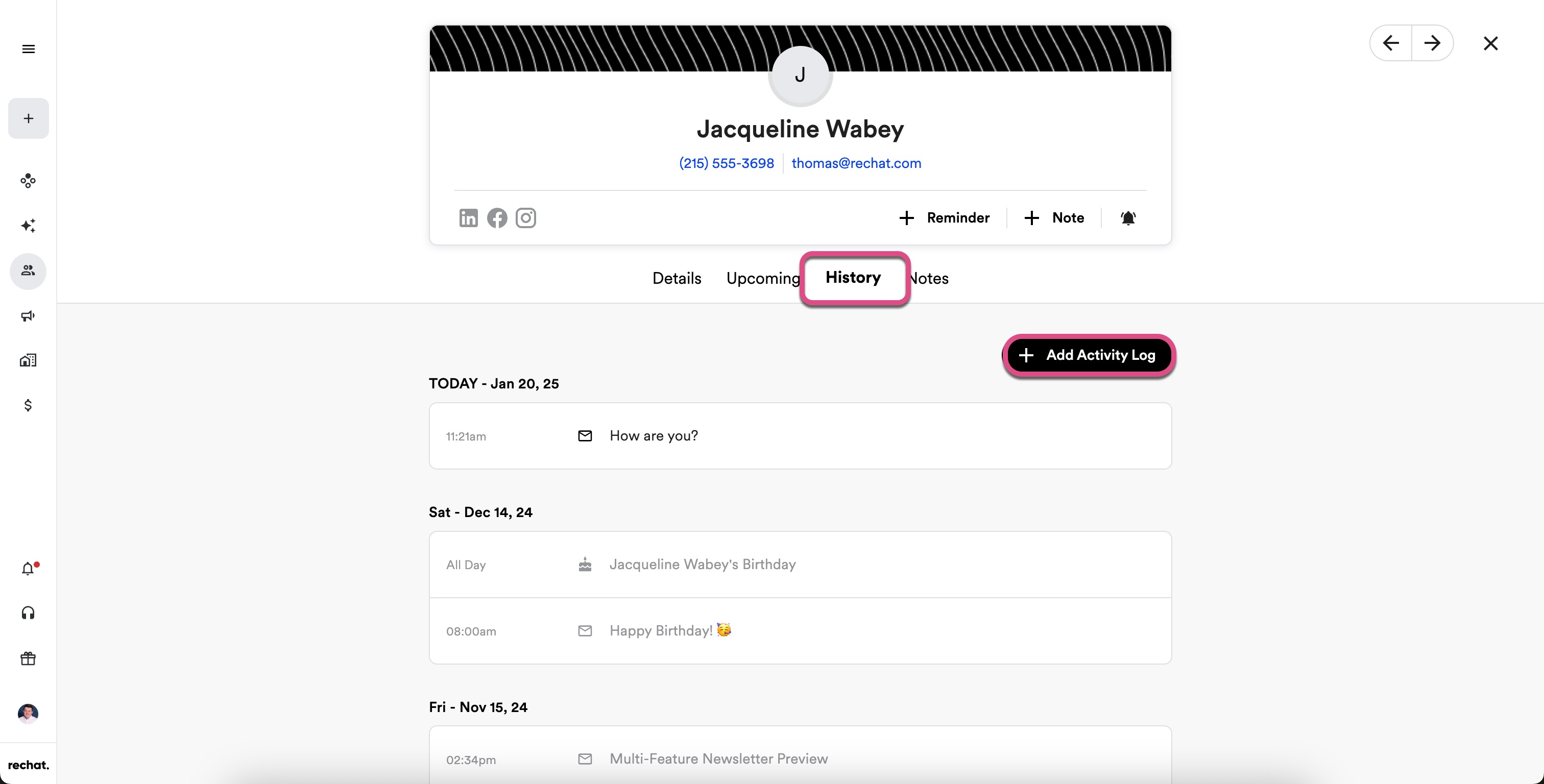 Contact Tabs: Allows you to switch between contact details (default), upcoming reminders and tasks, historic contact activity, and contact notes.